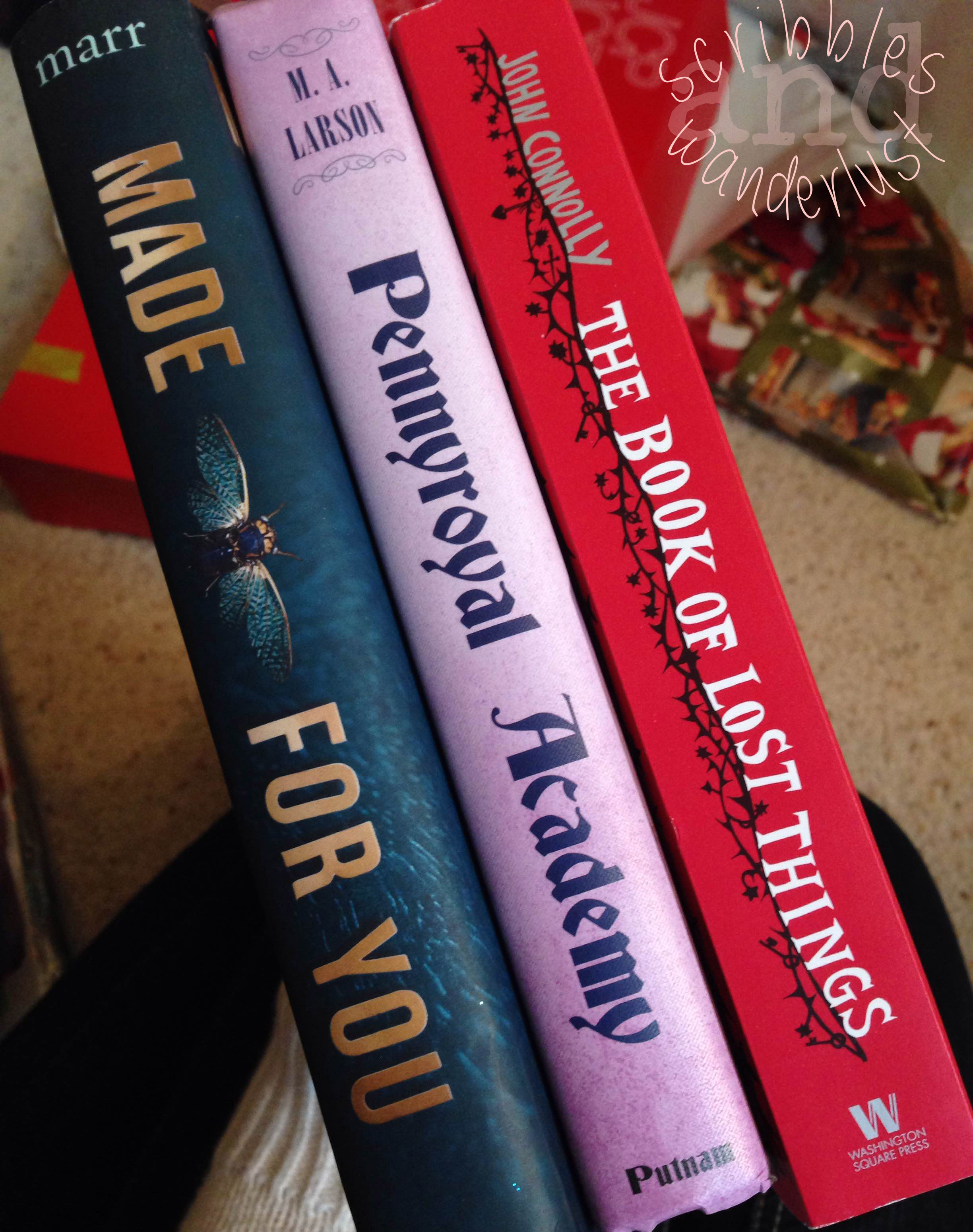 What cracks me up is that the list we gave each other reflected our own reading preferences, and the books we picked from that list to buy and send off reflected even further our reading preferences. For example, I sent the three of them my list, which was mostly MG and YA or slightly dark in theme. Hannah chose to send me Pennyroyal Academy, which is light and fun and MG and a genre she wants to dive into. Morgan chose The Book of Lost Things, which is adult and dark and veering away from the genre she was most submerged in recently. Alyssa chose Made for You, a YA romantic thriller, something I think Alyssa loves without realizing it.